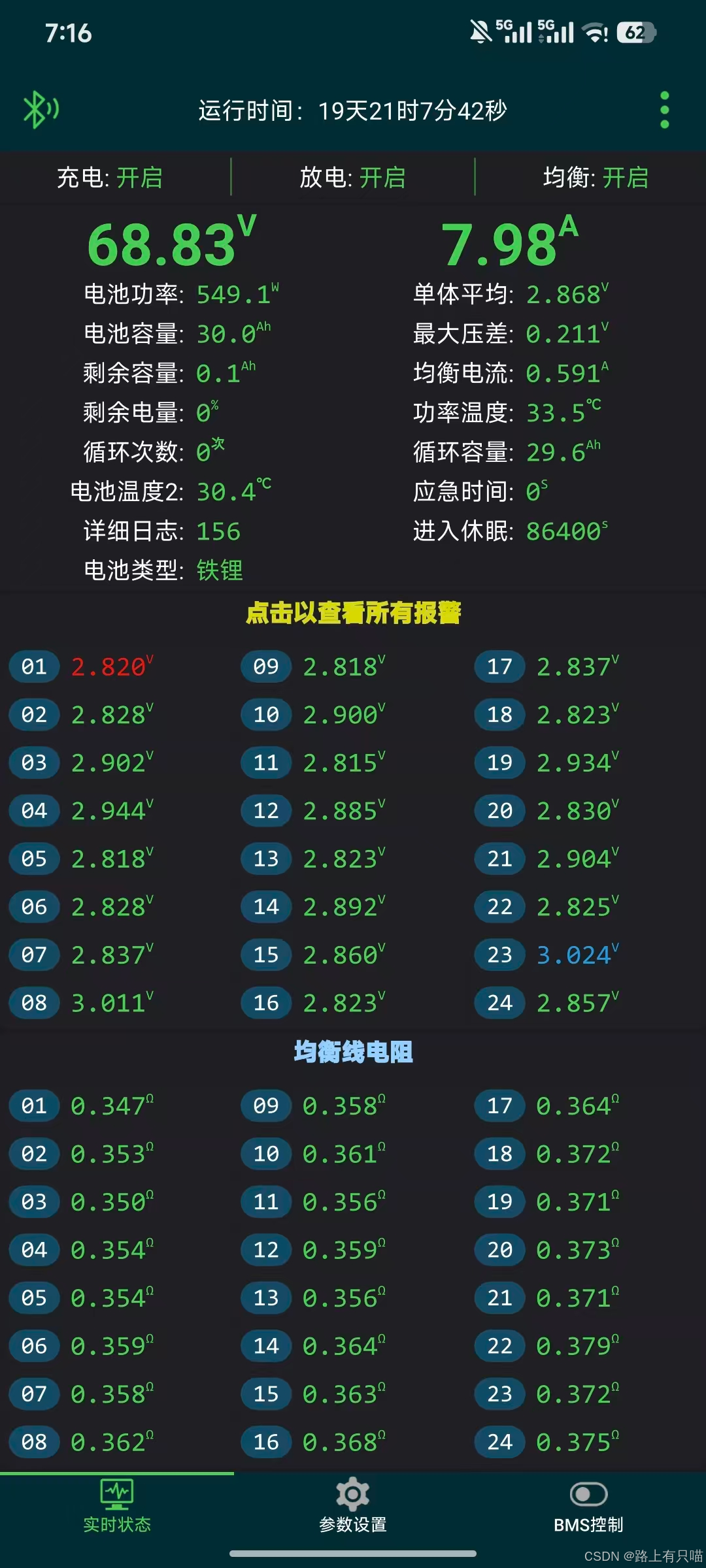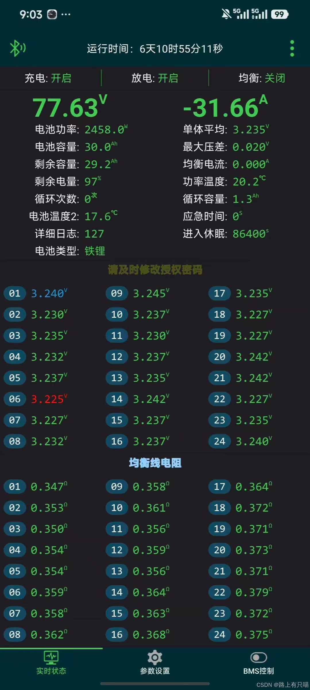 电池组温度 :约20℃ 数据显示,在大功率负载下,电池组压差极小,表明前期电芯匹配(内阻、容量)精准;新型紫铜带焊接有效保证了过流能力,无明显热点与压降异常。