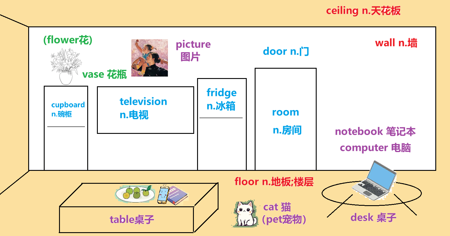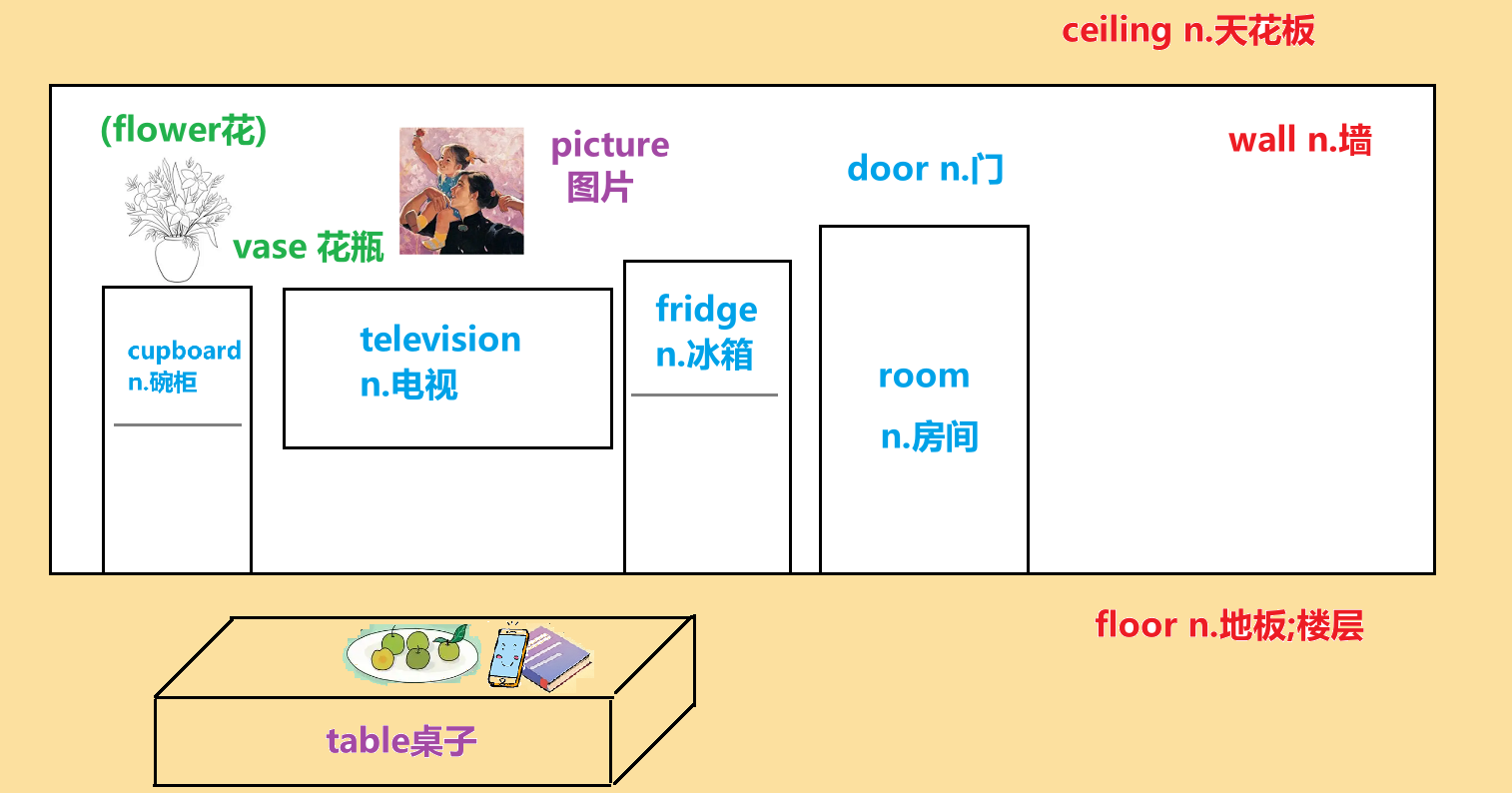当然,这只是一个示例,我们其实还可以进一步深化,比如在墙边放上一把扫把(broom),或者拖把(mop),在桌子上,再放上一只杯子(cup),或者一瓶(bottle)水(water),或者一包香烟(cigarette),在天花板上再画个椭圆,表示顶灯(topligjht),都是可以的。
