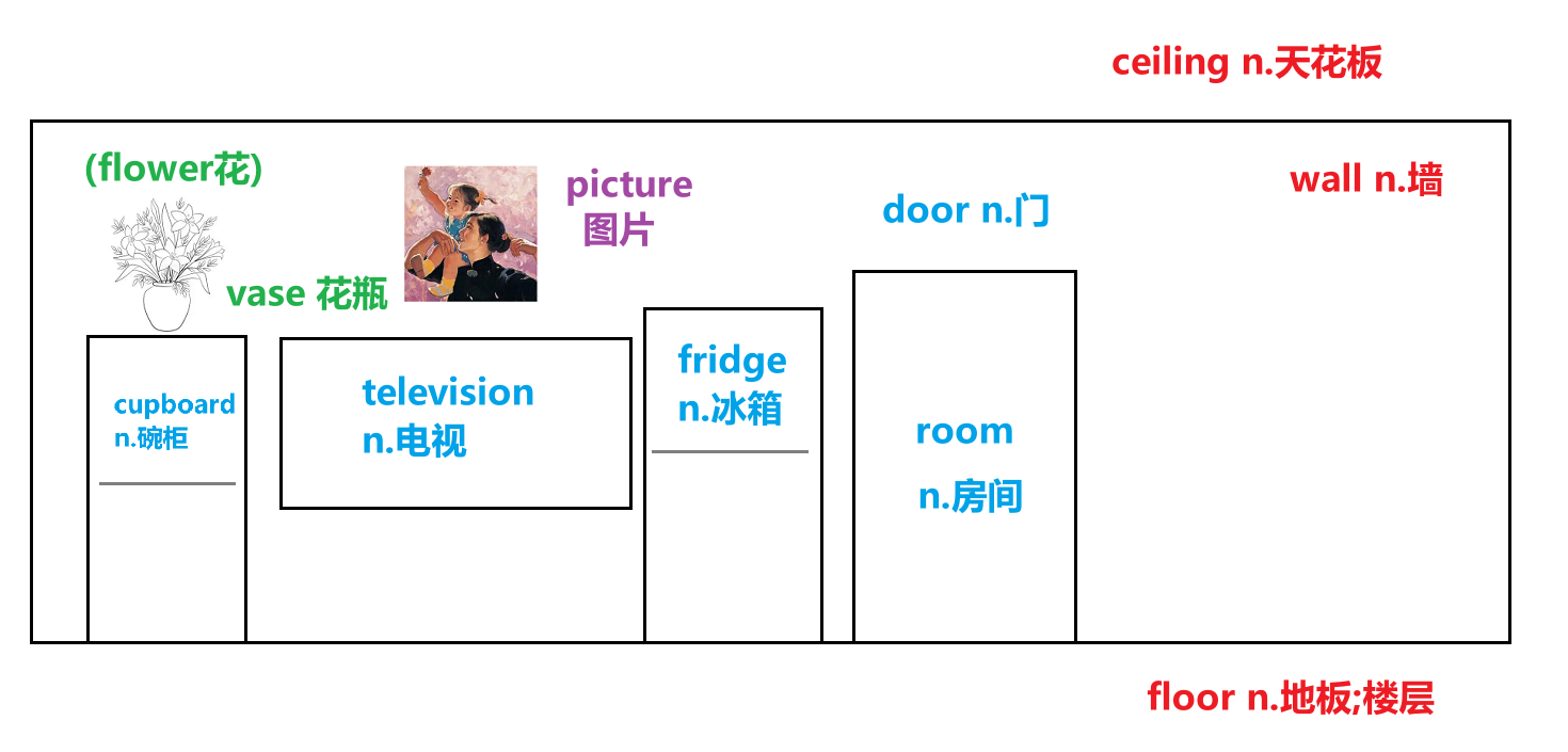 在电视左边,再来一个落地的框,表示碗柜(cupboard),并在柜之上画个花瓶(vase),插上鲜花(flower),并且在电视上方,贴幅图片(picture)吧:
