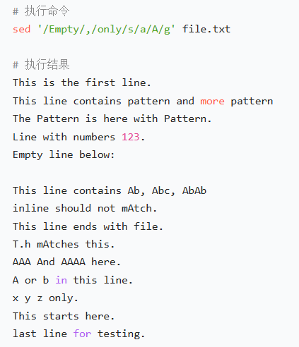 处理从 "Empty" 匹配行到 "only" 匹配行之间的内容,替换 "a" 为 "A"