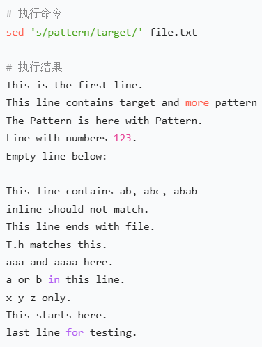 (1)基础替换(每行仅替换第一个 "pattern" 为 "target")