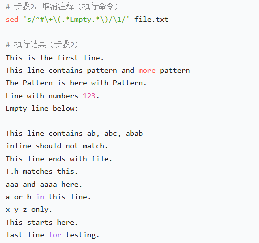 (3)输出:将模式空间的内容打印到标准输出,清空模式空间,重复上述步骤直到文本处理完毕。