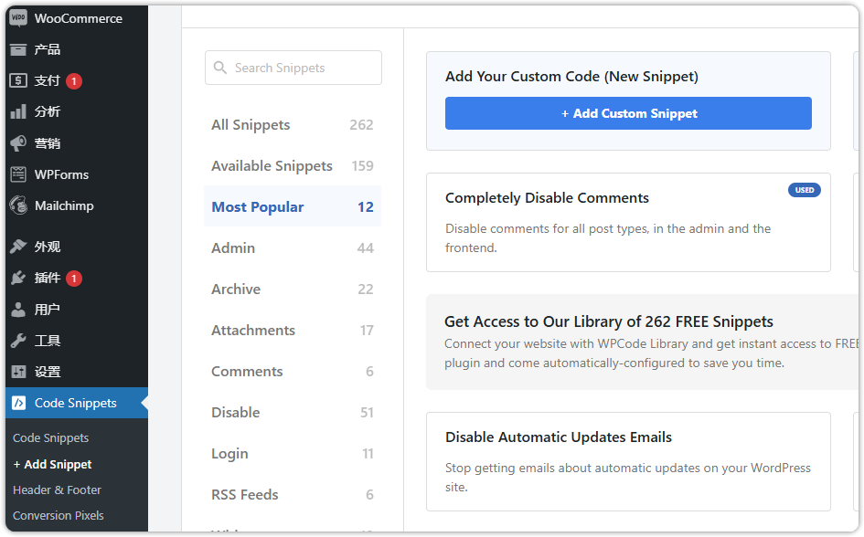在 WordPress 中,您可以使用像 WPCode 这样的插件来轻松添加自定义代码,而无需修改主题的 functions.php 文件。WPCode 插件让用户可以直接在 WordPress 控制面板中添加代码片段,避免了出错的风险,尤其适合没有太多编码经验的用户。