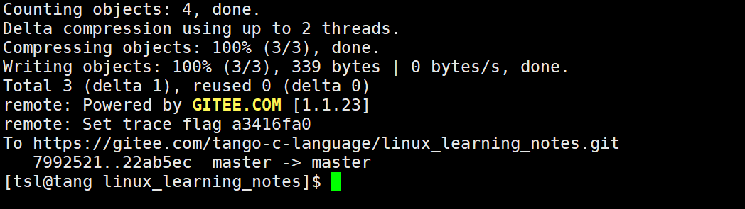 在执行git push之后,需要我们输入gitee的用户名和密码才能上传成功。