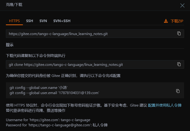 git上传文件,需要我们配置运行用户名和邮箱;在我们点击克隆/下载时,就有提示