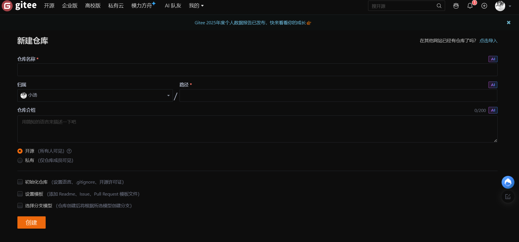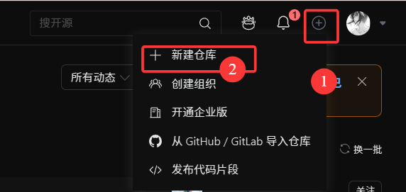 在注册完成账号后,来到个人主页,点击右上角头像旁边的+,点击创建仓库,进入创建仓库的界面。