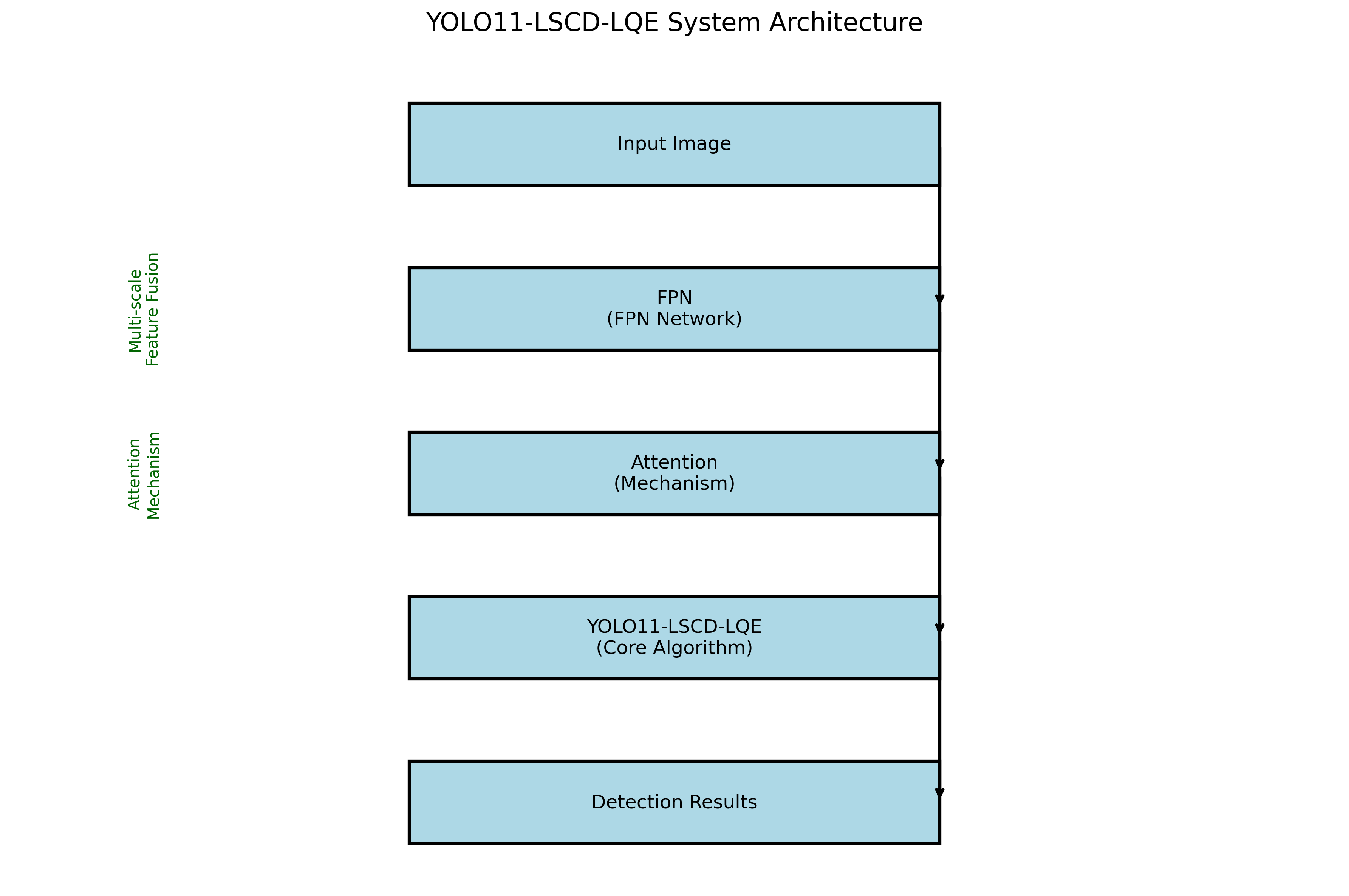 本系统基于YOLOv11架构,结合LSCD-LQE(Lightweight Spatial-Channel Dual-branch Quality Enhancement)轻量化空间-通道双分支质量增强模块,构建了高效的目标检测框架。系统整体架构如下图所示: