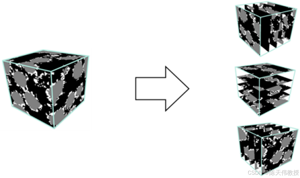SliceGAN 的工作原理与 GAN 类似。生成器负责生成材料的三维结构,而判别器则判断这些生成的三维结构是否合理。然而,SliceGAN 面临的一个关键问题是:我们通常并没有材料的三维结构数据,那么如何在训练样本缺失的情况下进行有效训练呢?
