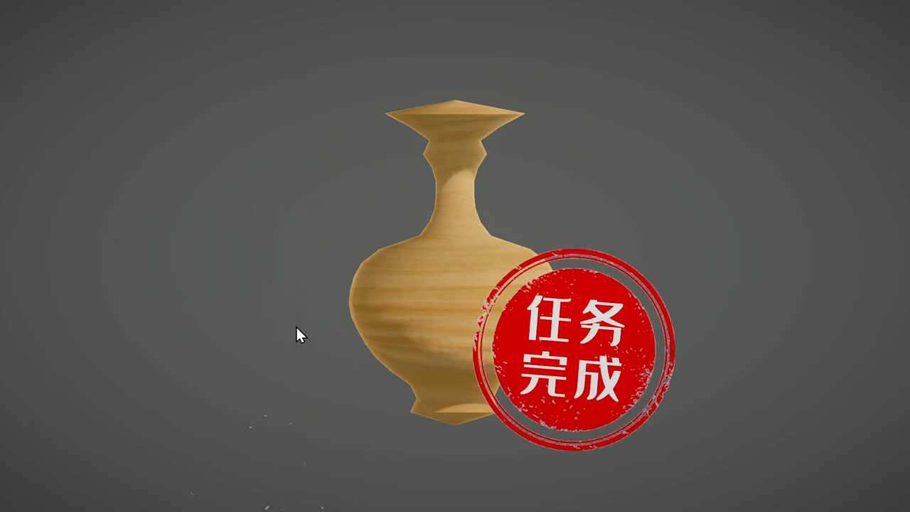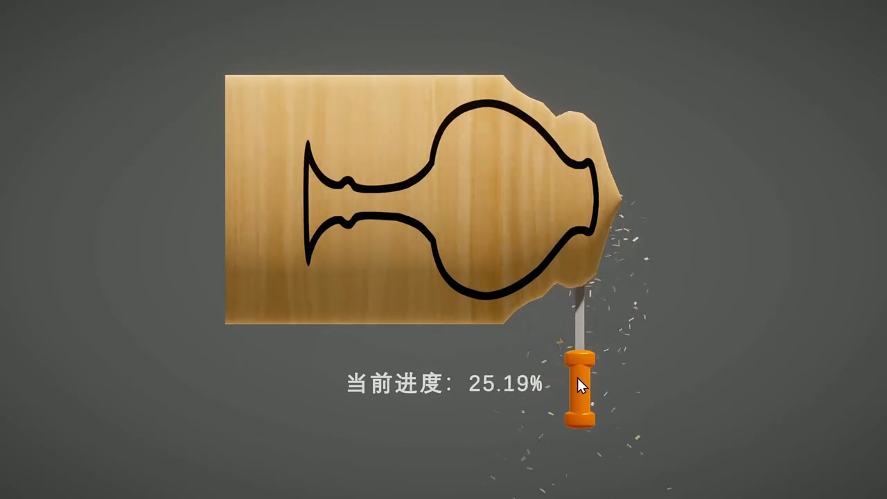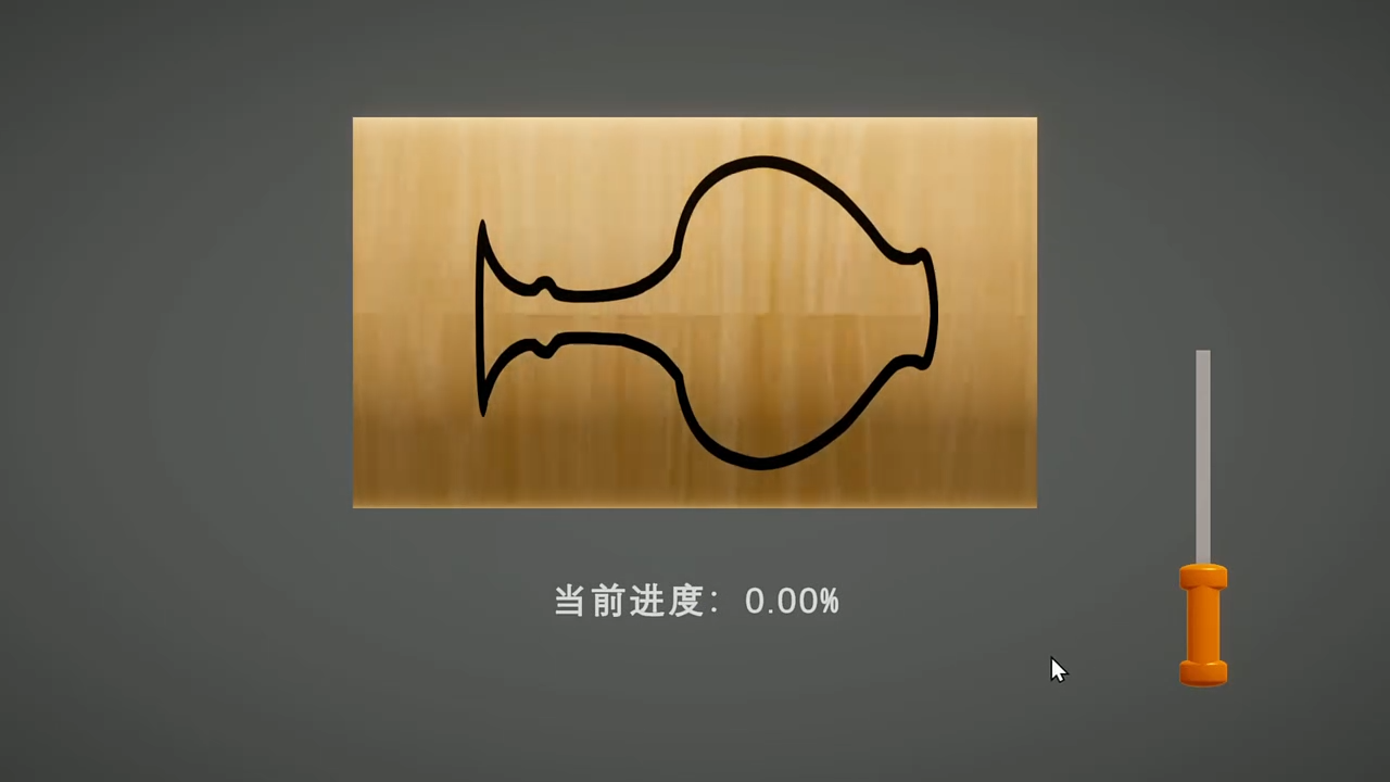 基于 Unity3D 引擎开发木胎雕刻小项目。玩家鼠标左键拾取刻刀,靠近圆柱木胎后按预设花瓶造型进行雕刻。界面下方显示进度,过程伴随木屑粒子与音效;进度达 100% 时展示完整花瓶,并提示任务完成。