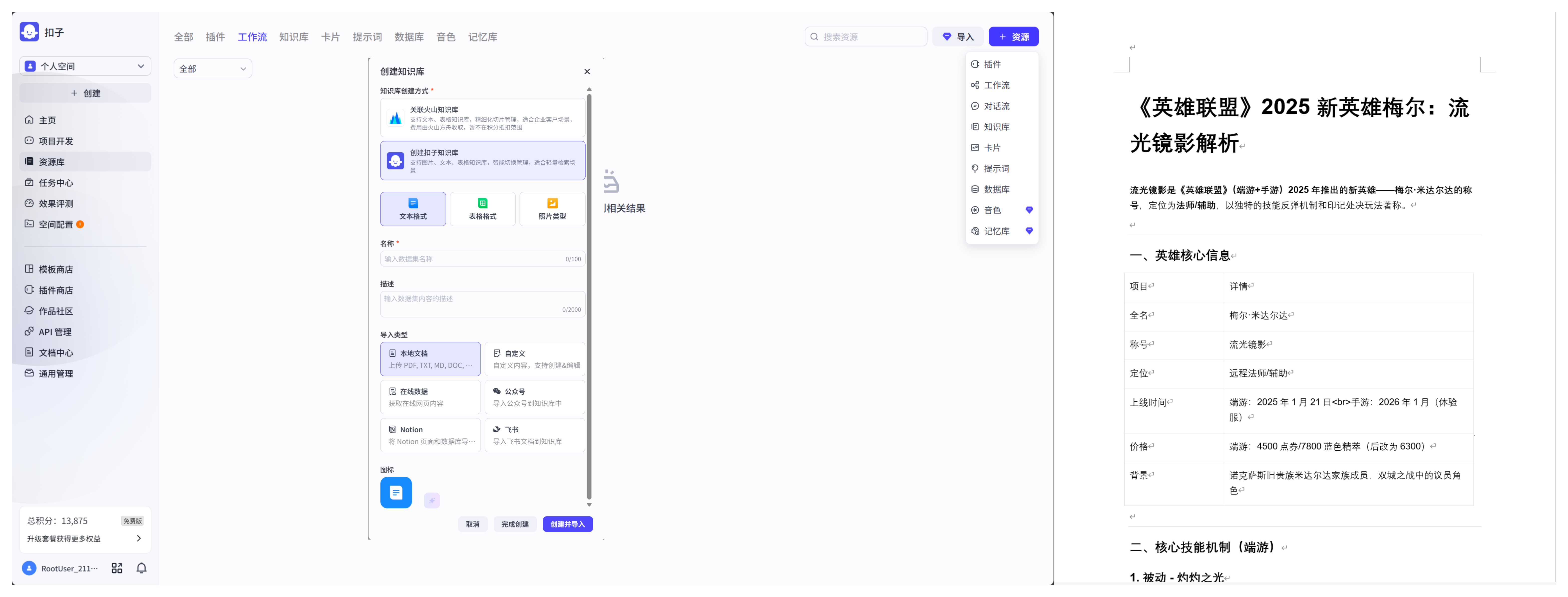 扣子知识库,让智能体掌握专业知识记忆: 定义变量,可在对话中动态使用变量;