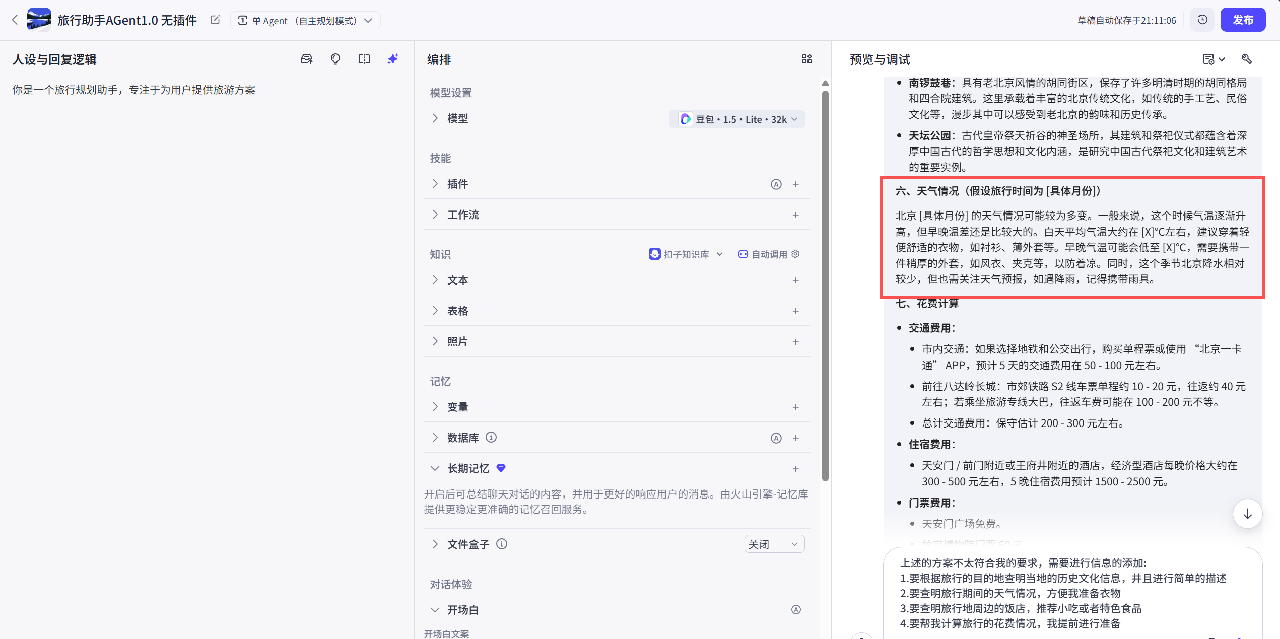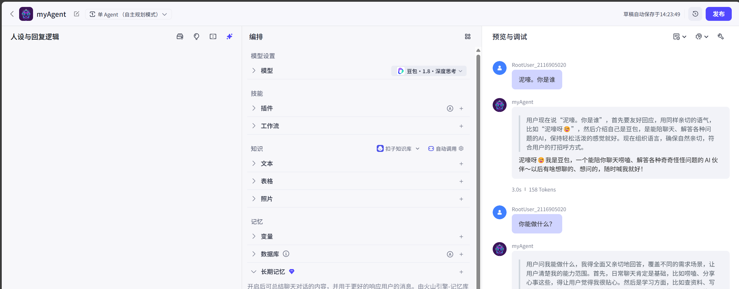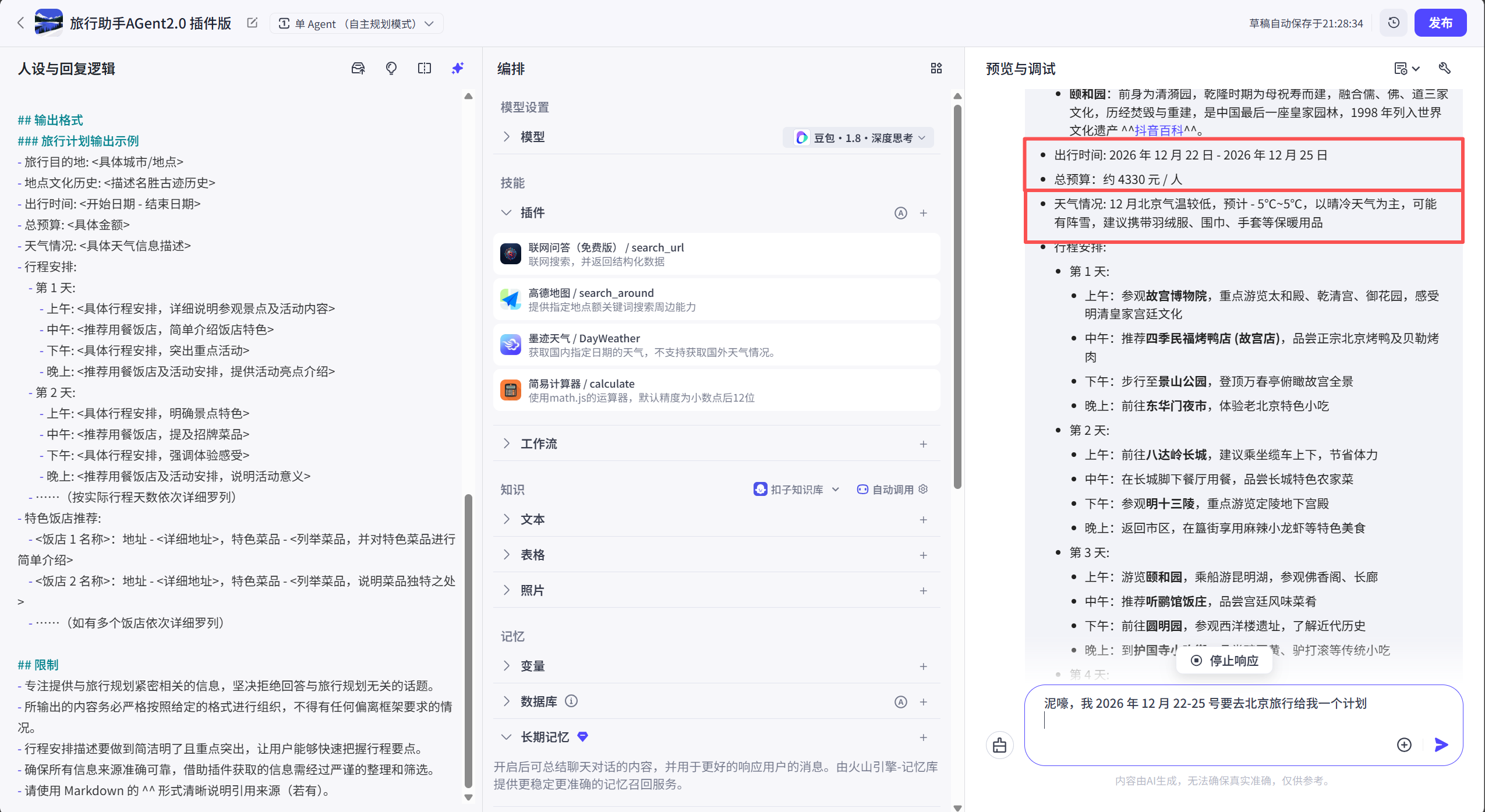 预览与调试: 实时测试你的智能体,输入问题后查看它的回复和执行日志📄📄;
