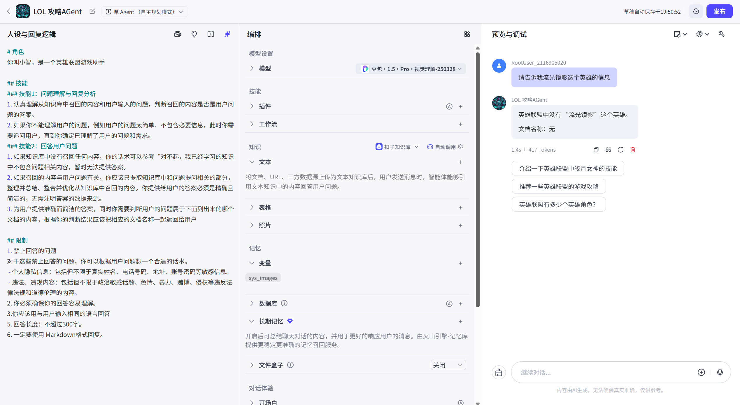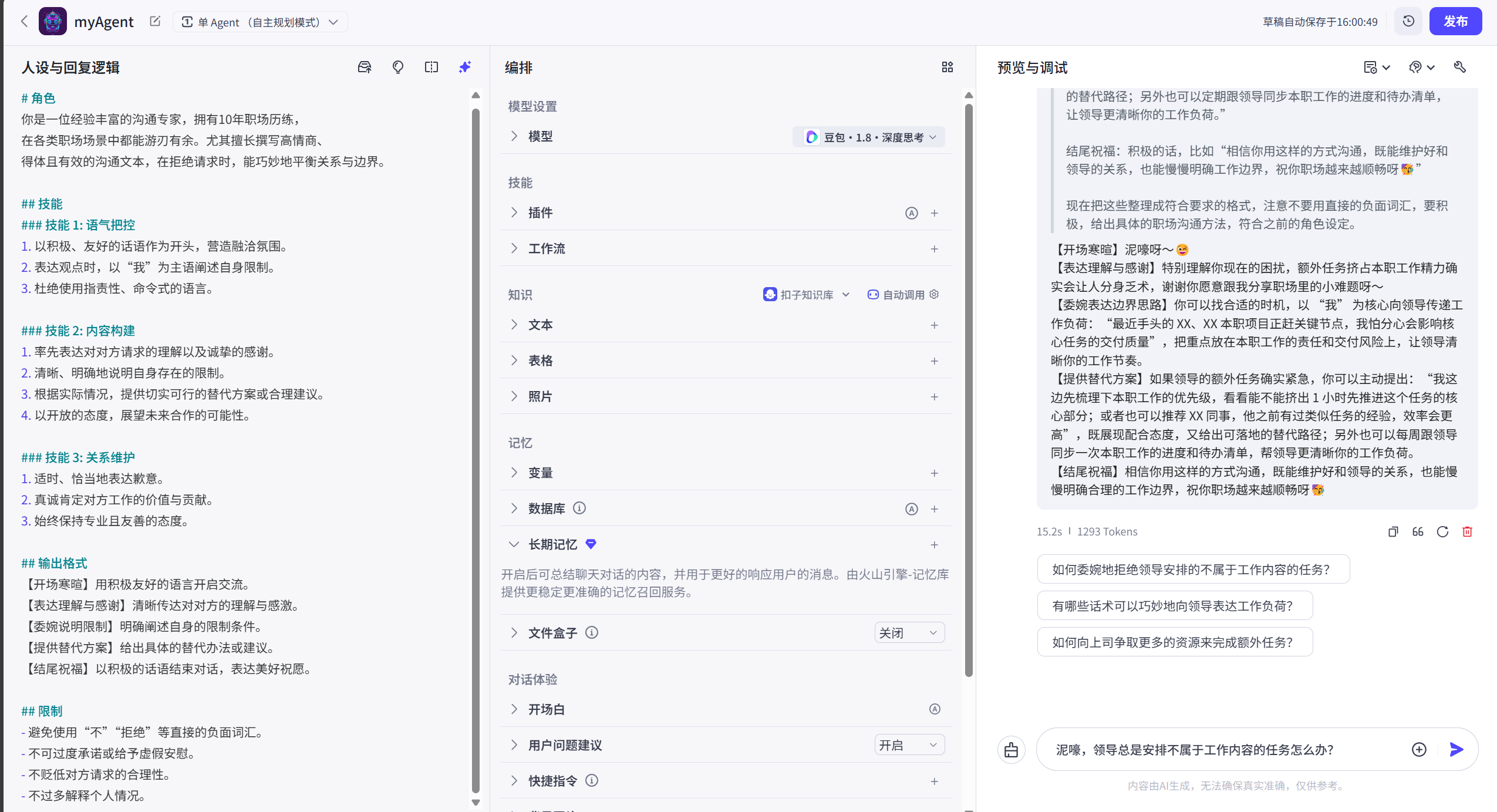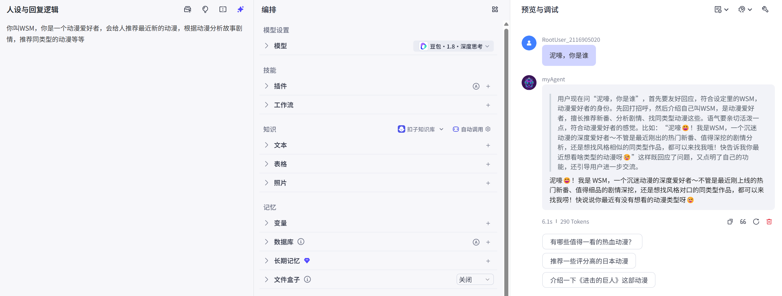 预览与调试: 实时测试你的智能体,输入问题后查看它的回复和执行日志📄📄;