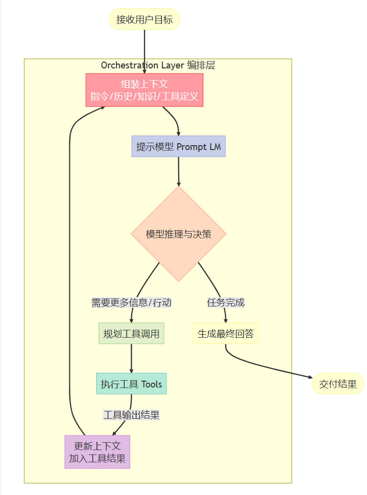 查询天气"或"检索数据库,编排层拦截意图,执行相应代码