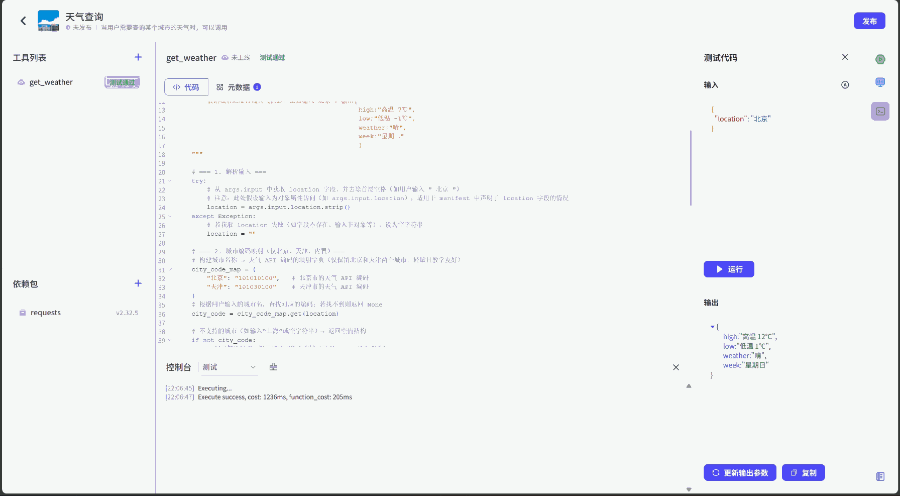 根据城市地址查询天气信息,比如输入"北京",输出{