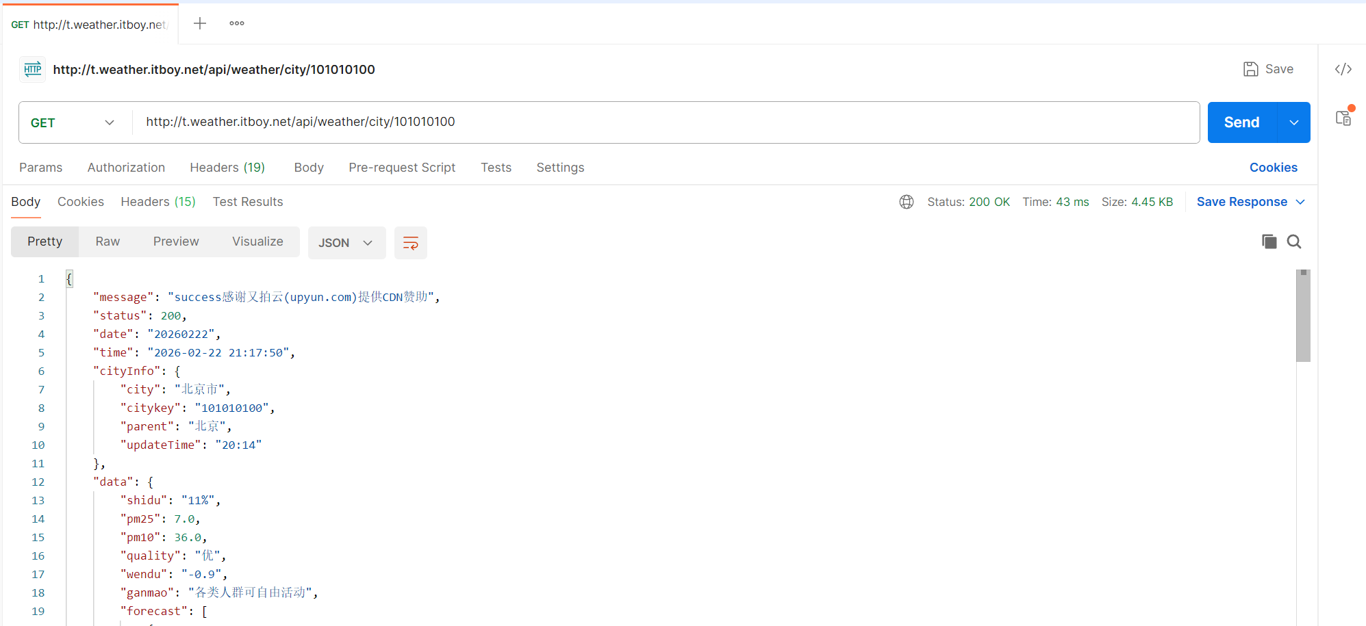 Python 请求接口的脚本: 注意脚本中仅配置了 北京、天津城市编码 所以不支持其他城市天气查询;