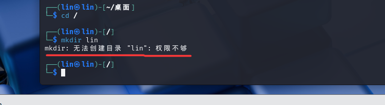 为什么不可以呢?因为你的权限是普通用户,你没有管理员权限,普通用户的权限只有家目录下边可以操作,就是/home/lin里,也就是漂浮号~里