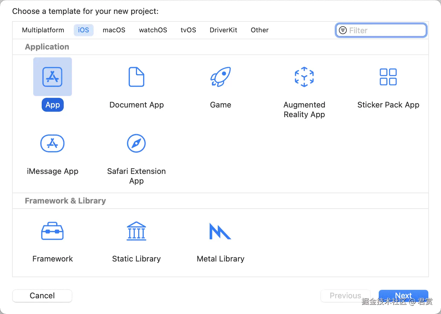虽然 SwiftUI 可以跨平台,我们目前也不考虑其他平台,就直接用 iOS 的 App 模板创建项目,你会发现大部分创建的项目都是多个平台创建是一样的。