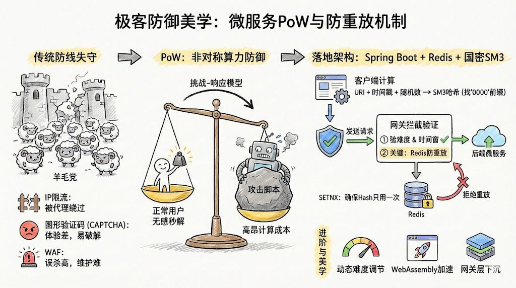 提到工作量证明(PoW,Proof of Work),大多数技术人员的脑海中会立刻浮现出比特币、矿机以及庞大的电力消耗。然而,抛开加密货币的语境,PoW 的底层哲学------非对称的计算成本------实际上是应用层安全防护和微服务网关限流的一把极客利器。本文将跳出传统的公链思维,深入探讨如何利用 Java 与 Spring 生态,结合国密算法与 Redis 高可用架构,在企业级微服务中落地一套优雅的 API 防刷与防重放机制。