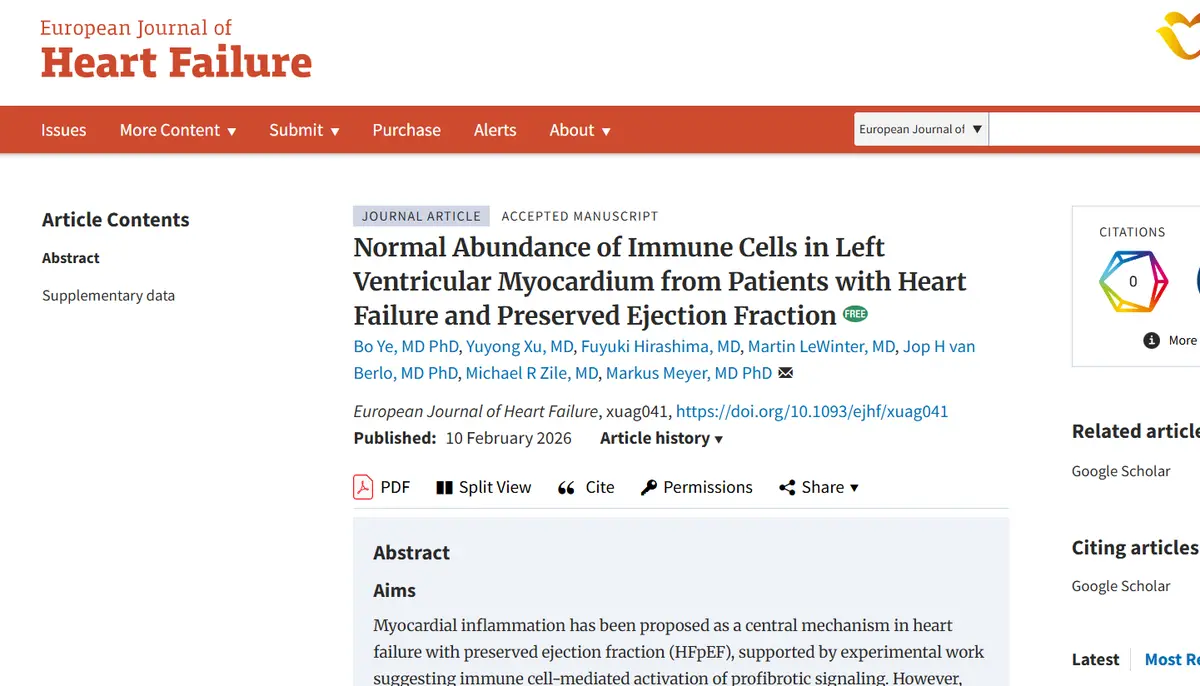 对相邻组织切片进行CD45心肌免疫荧光的定量分析,结果证实了免疫细胞丰度正常,组间无显著差异。参照对照组心肌中免疫细胞的相对丰度为1.9(1.2)%,而B期和C期HFpEF心肌中分别为2.8(3.0)%和2.1(1.5)%。同样,针对CD68(一种富含于溶酶体细胞如巨噬细胞的标志物,既往曾有报道称其在HFpEF患者心肌中富集)的免疫荧光检测显示,各组间无差异。针对CD3G阳性细胞(T淋巴细胞标志物)的检测也观察到类似结果,各组间无显著差异。