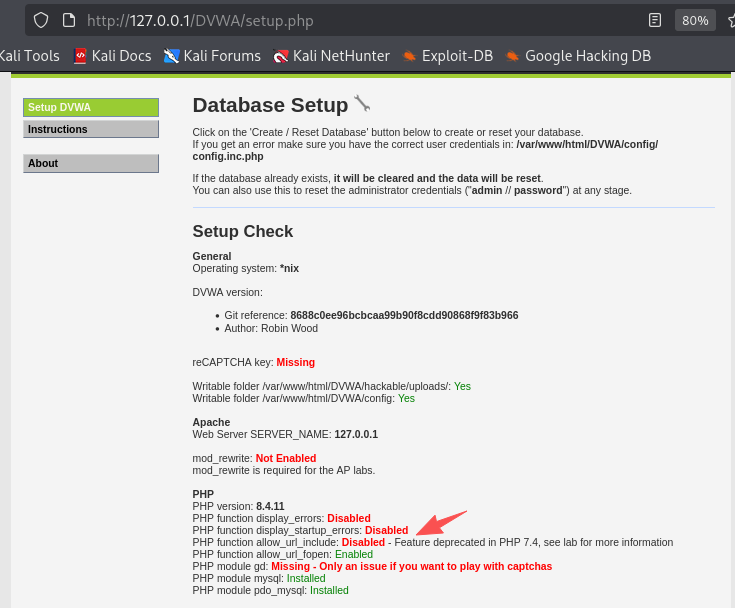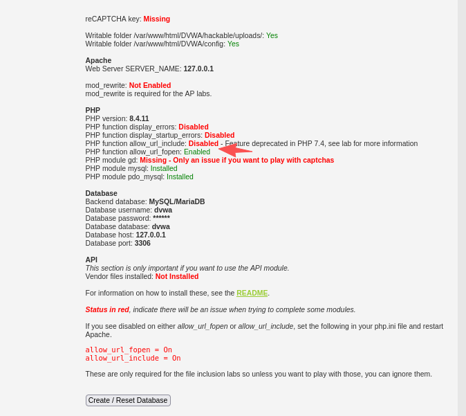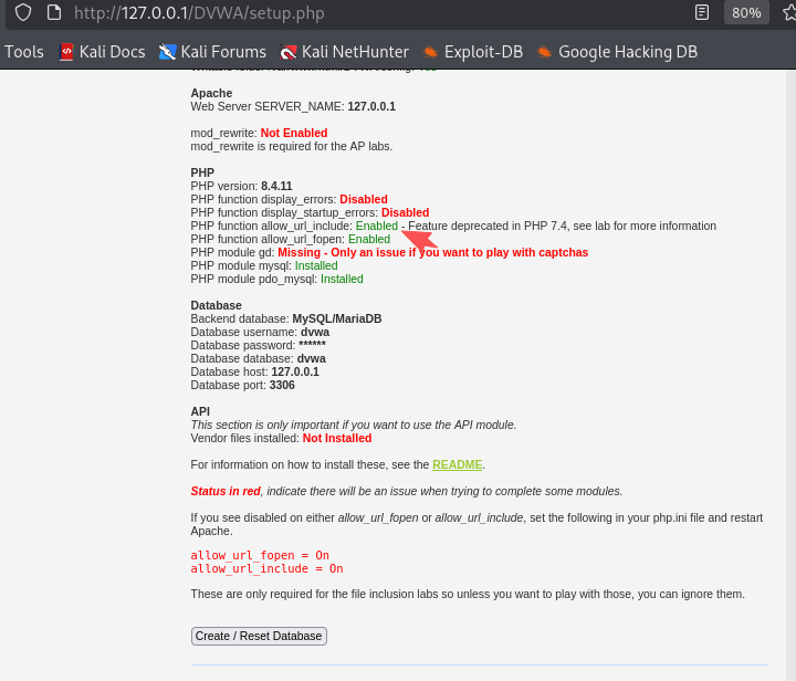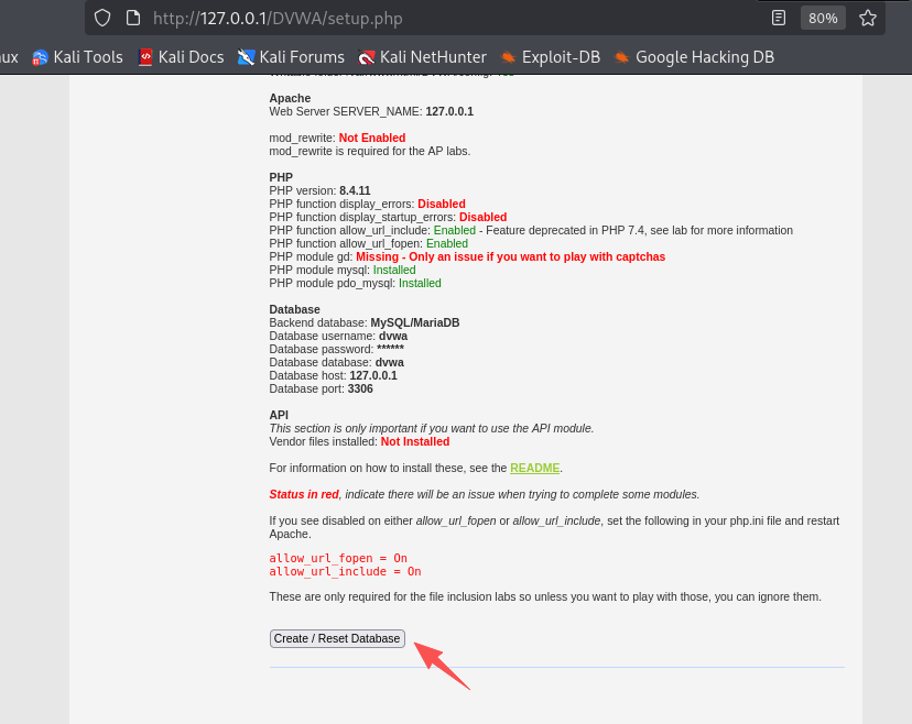 登录 127.0.0.1/DVWA/setup.php, 启动DVWA的安装检测