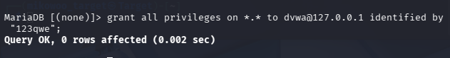 grant all privileges on *.* to dvwa@127.0.0.1 identified by "123qwe";