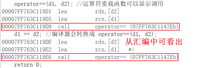 operator==(d1, d2); //运算符重载函数可以显示调用