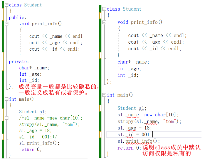 2、C++中struct和class都可以用来声明类,但是class的所有成员如果没有限定符修饰默认限定符都是私有的,struct的所有成员如果没有限定符修饰默认限定符是公有的。