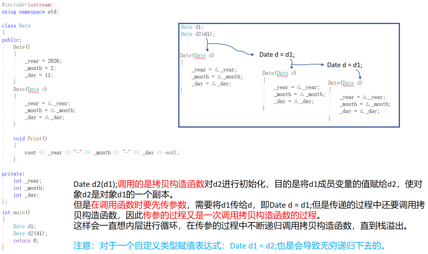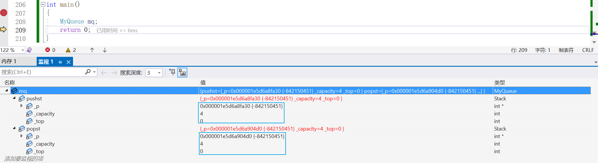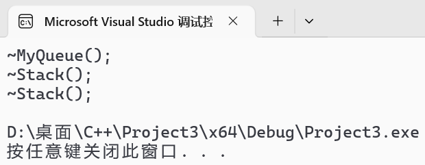 注意:上面代码的MyQueue mq1;会自动调用MyQueue的默认构造函数,但是对于自定义类型成员会直接调用自定义成员的默认构造函数即Stack(){}。此外,MyQueue mq2 = mq1;MyQueue调用它自动生成的拷贝构造,对于其中自定义成员变量pushst和popst,会调用他们自己的拷贝构造,进调用Stack拷贝构造完成pushst和popst的拷贝,只要Stack拷贝构造函数自己实现了深拷贝,就不会出错。