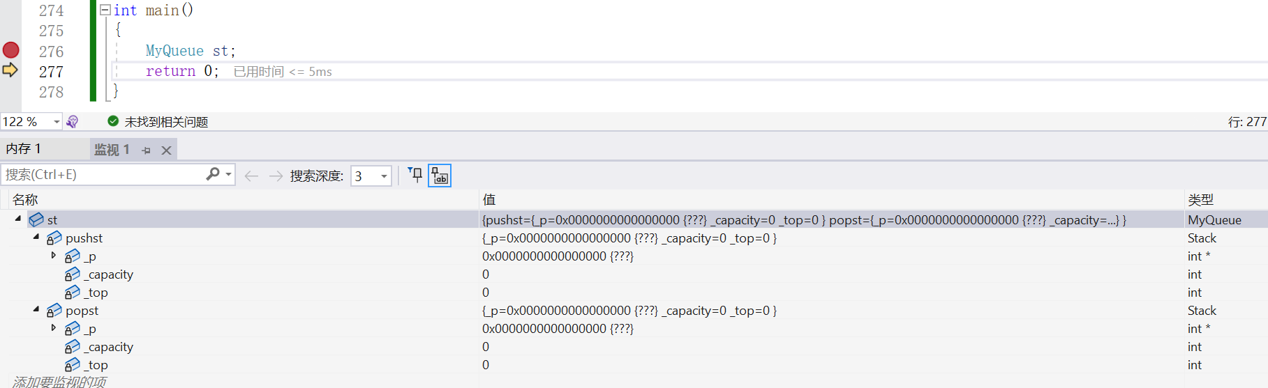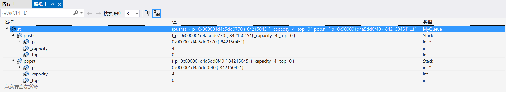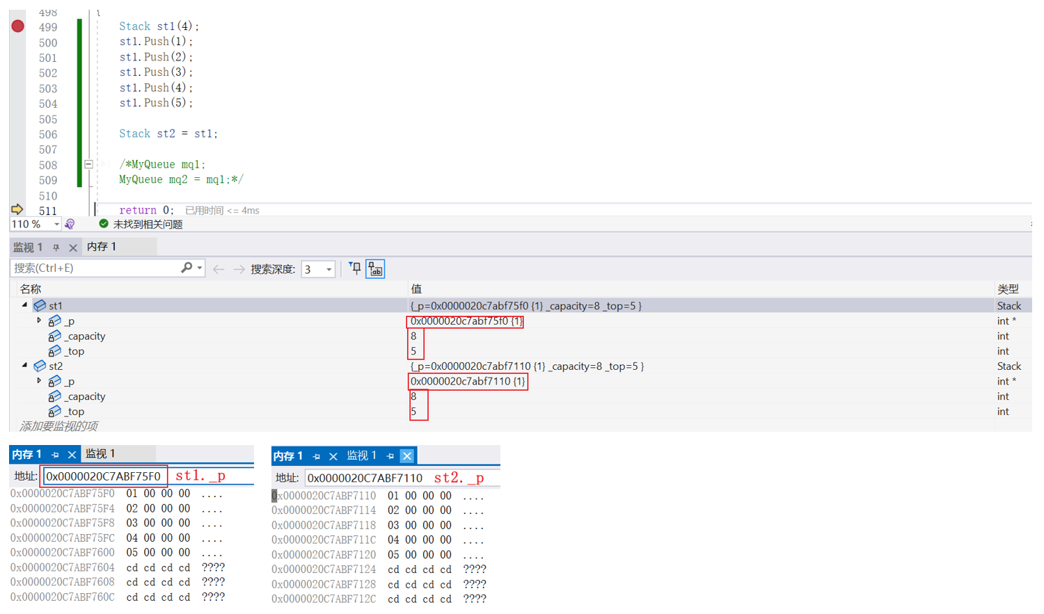 根据调试结果可得st1._p和st2._p指向两个不同的内存空间,当调用它们的析构函数时,就避免了同一块空间被释放两次的风险。