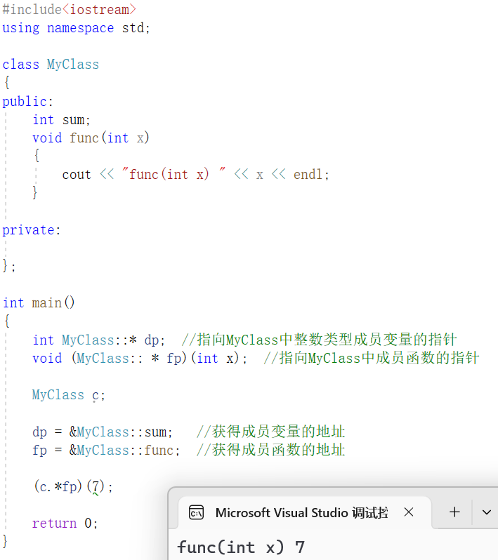 上面程序中,变量d是指向 MyClass 类型对象的指针,所以应该使用->*运算符来访问sum和func()。成员指针是为了处理特殊情况而设计,在一般程序设计中通常不需要用到他们。