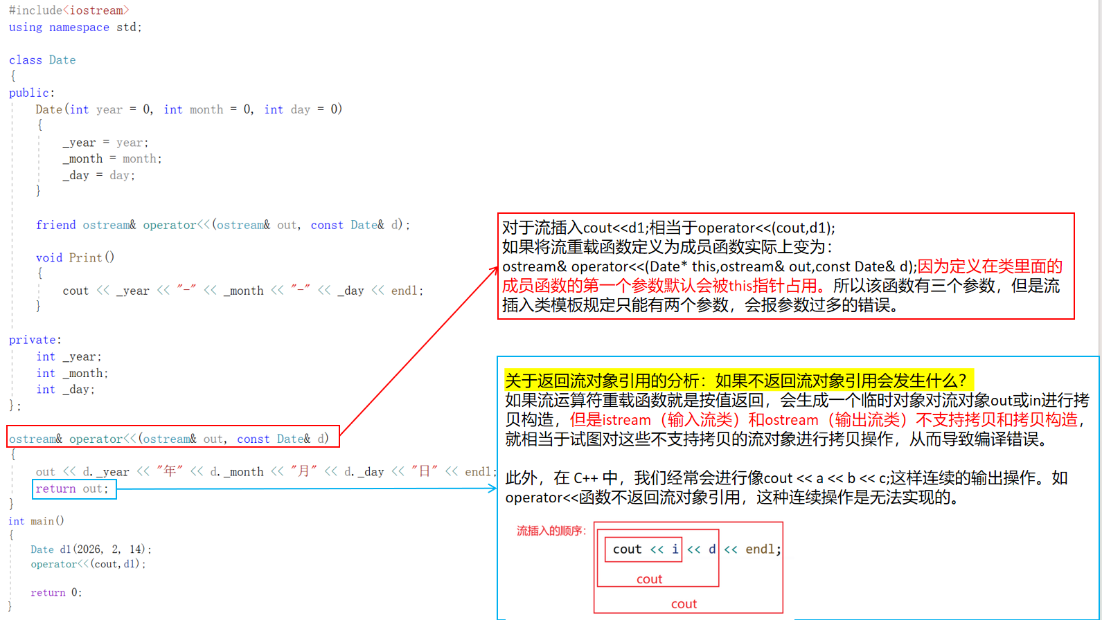 在重载<<和>>时,需要重载为全局函数,因为重载为成员函数,this指针默认抢占了第一个形参位置,第一个形参位置是左侧运算对象,调用时就变成了 对象<<cout,不符合使用习惯和可读性。重载为全局函数时只需把ostream/istream放到第一个形参位置就可以了,第二个形参为类类型对象。当重载为全局函数时,因为类的成员变量是私有的,不能在类的外部直接访问类对象的成员变量,所以通常将流运算符重载函数声明为类的友元函数,这样可以直接访问类的私有成员。如果不使用友元函数,需要提供公共的访问函数来获取类的成员数据。