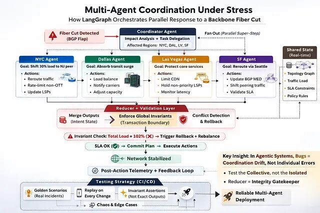 具体场景是骨干网光纤切断事件的自动响应。当故障被检测到时,一个 Coordinator Agent 分析影响范围,将任务分发给四个并行的区域流量智能体,分别负责纽约、达拉斯、拉斯维加斯和旧金山。四个智能体并行工作,转移流量负载,对非关键服务施加限速,目标是在级联拥塞发生之前完成处置。