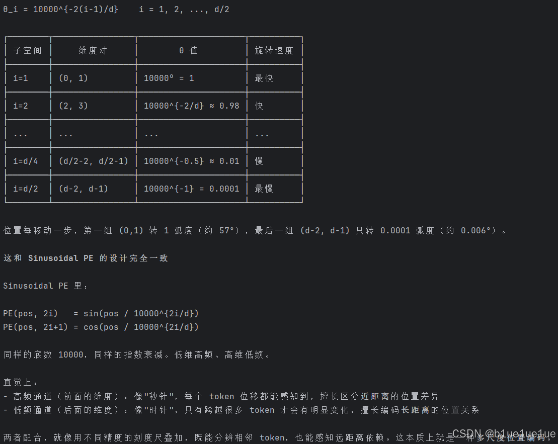 - Rope:旋转位置编码,相比于传统位置编码把位置向量加到词嵌入上,他在计算自注意力时才会加上 Query 和 Key 的相对位置信息,此外 Rope 本质上等价于把 feature_dim 分成 feature_dim/2 组,然后每两个维度的 feature_dim 形成一个封闭的二维平面,按照相对位置以及 feature_dim 的 i 计算角度 θ 并旋转 ,768 个 feature_dim 分成 384 组,每组学习不同波长的相对位置信息 (低频)