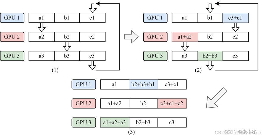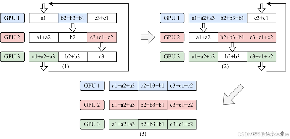 最后按照 All-Gather,每个工作节点将包含最终结果的块数据块交换, 这样所有的结点就会得到一个完整的结果