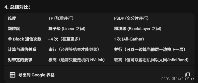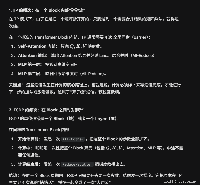 - TP:Tensor Parallel,张量并行,如 vllm,对于每一个 Layer 额外拆分为若干次核心计算 ,他会把矩阵乘法拆成小矩阵,每个矩阵直接计算对应的激活值再做 All-Reduce,而不会额外如 FSDP 一样先凑齐这一 Layer 的全部参数,因为涉及到频繁的 All-Reduce,因此对于通信的延迟要求会更高,因为后面每一次的计算都需要依赖上一步的结果,而 FSDP 因为预取(Prefetching,GPU 在计算第一层时,已经知道第二层需要哪些参数了,可以先后台拉取第二层参数),所以对延迟要求不高。