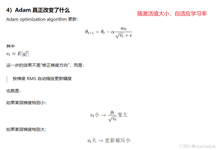 - RMSNorm+PreNorm:LayerNorm 在注意力计算完计算残差之后,x+1=LayerNorm(x+f(x)),需要归一化以保证激活值符合正态分布,但是大家在后来发现,模型并不在乎向量是不是以 0 为中心,只在乎它的"长度"不要爆炸(1. 前向传播时,每层输入的特征 x 稳定,2. 反向传播时梯度稳定),因此大家除以 RMS 均方根归一化即可; 此外在 LayerNorm+PostNorm 的组合里面,当前 layer 学到的 f(x)还需要经过归一化,第一层学习到的残差,经过 96layer 的归一化后其原始学习到的特征被扭曲,导致梯度衰减,因此使用 RMSNorm+PreNorm,x+1=x+f(PreNorm(x)),此时 f 函数本身学习到的特征不会被扭曲,然后引入的新问题是 x 激活值本身虽然越深层其值越大,因此梯度也越大,但是受 Adam 优化器本身自适应控制梯度与学习率关系,其梯度可控