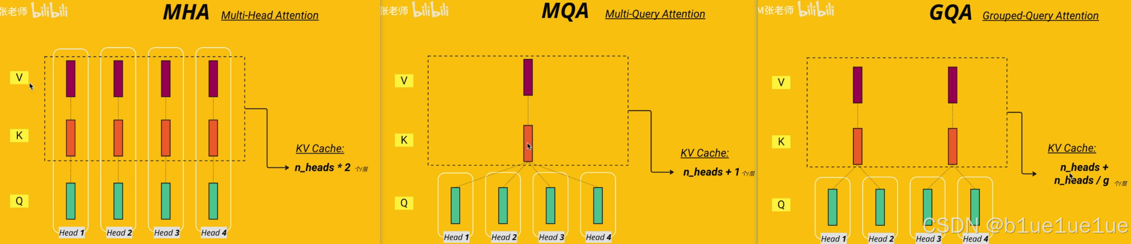 - 多头注意力: 主要针对 GQA,在 LLM 计算 Self Attention 时,KV Cache 复用,多个 Query (如4,8,16)作为一组 Group 共享 KV 头,节省缓存。
