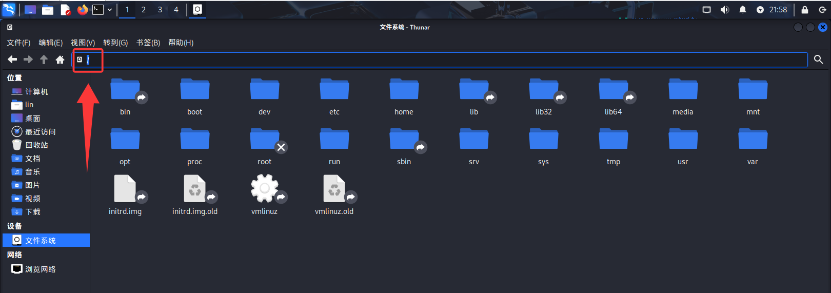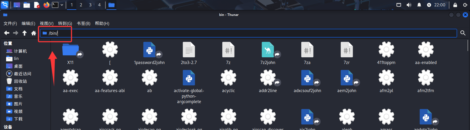 如果我们要打开bin文件夹,那就在地址栏输入"/bin/"再回车就可以了,因为kali是图形化的,你也可以直接双击文件夹
