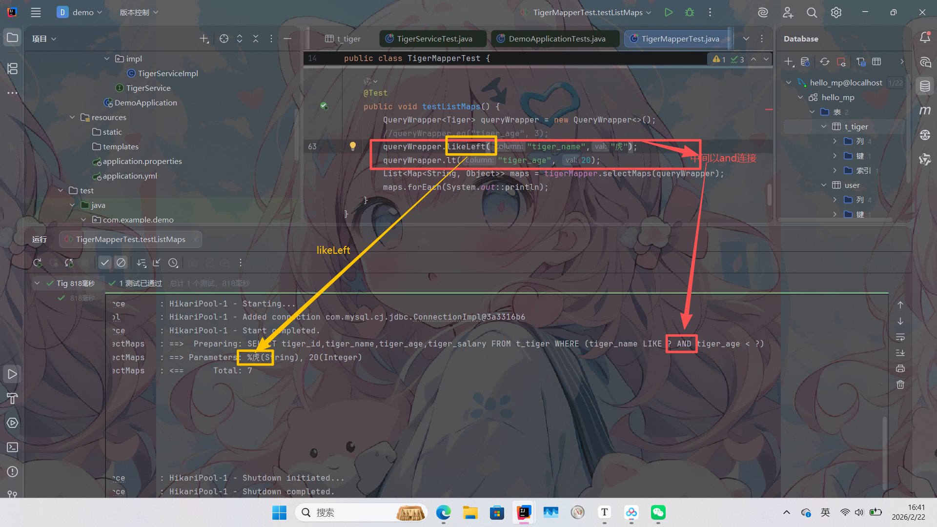 // 拼接条件:tiger_age = 5 AND tiger_name LIKE '%虎%'(引用实体属性,IDE自动补全)