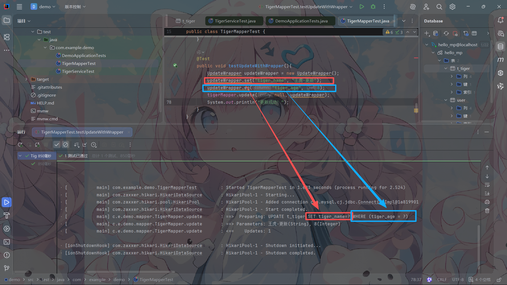 tigerMapper.update(null, updateWrapper);//entity = null 指的是:本次更新操作完全由 UpdateWrapper 来指定要更新的字段和值,不使用实体类 entity 中的任何属性。