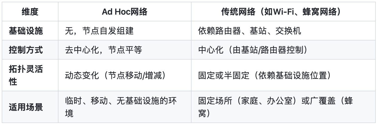 - Ad Hoc Networking(中文常译为自组织网络或临时网络)是一种**无需固定基础设施(如路由器、交换机、基站)**的无线通信网络,由设备(称为"节点")自发组建、动态调整,直接通过点对点(P2P)连接实现通信。