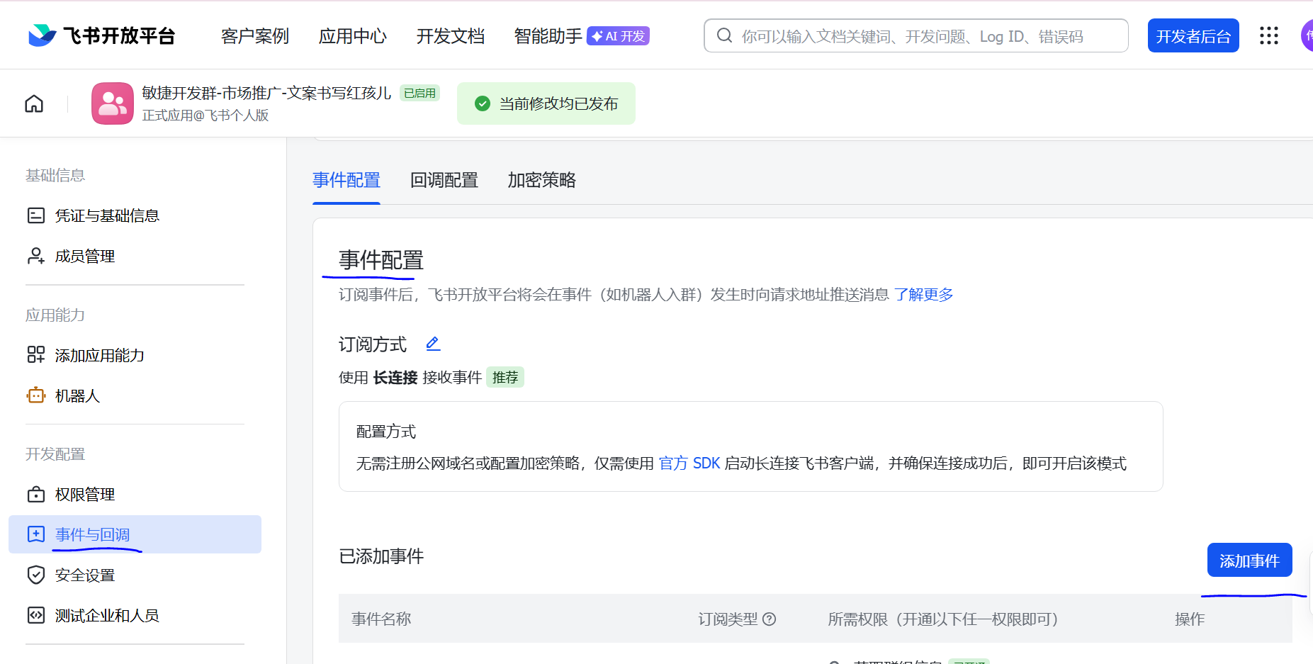 App ID/Secret并重启Gateway,然后再去飞书后台配置事件。 - 订阅方式 :必须选择 "使用长连接接收事件",而不是Webhook。