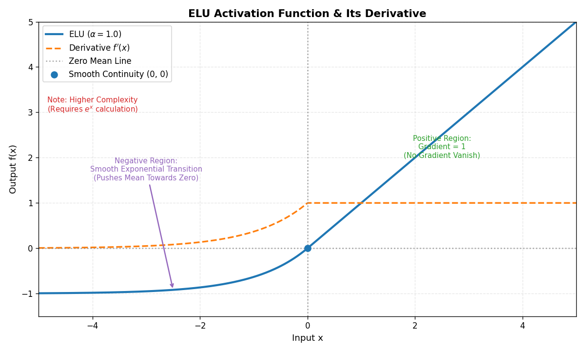| ELU | f(x)={xif x>0α(ex−1)if x≤0f(x) = \begin{cases} x & \text{if } x > 0 \\ \alpha (e^x - 1) & \text{if } x \leq 0 \end{cases}f(x)={xα(ex−1)if x>0if x≤0 | (−α,+∞)(-\alpha, +\infty)(−α,+∞) |