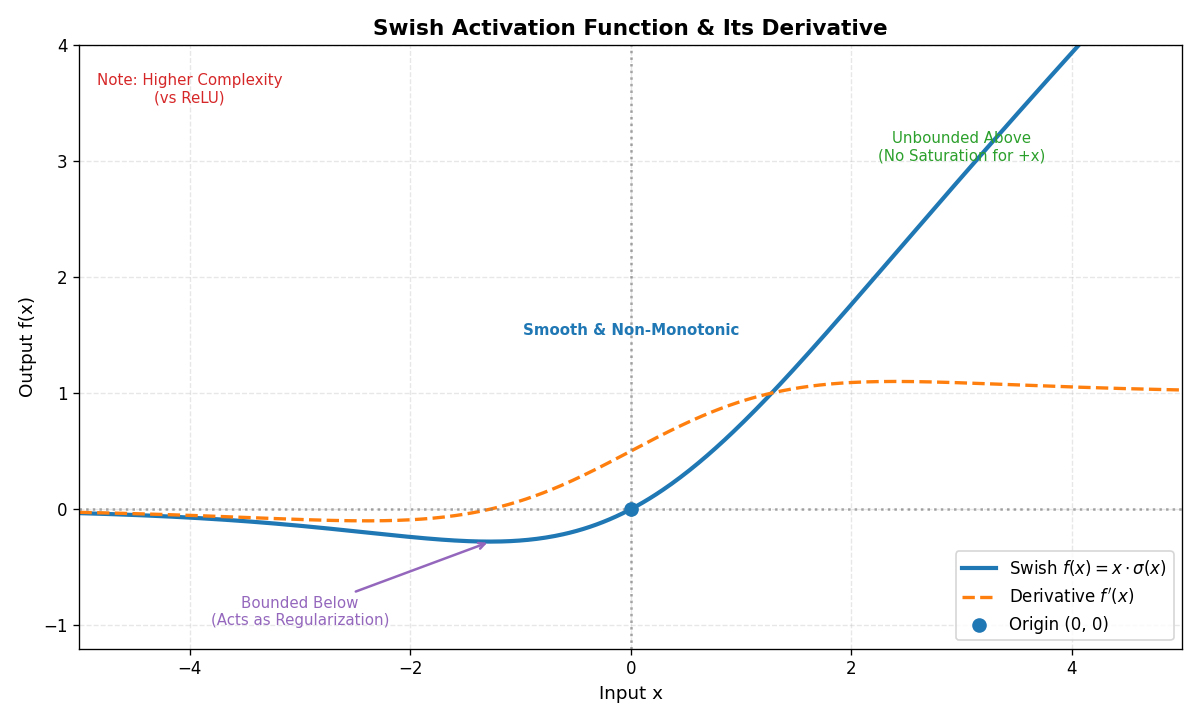 - 特点 :平滑的非单调函数,在深层网络中表现优于