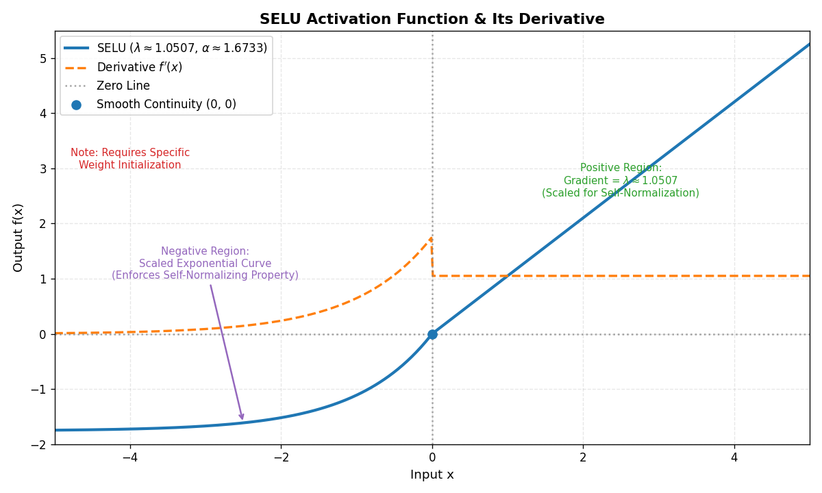 ELU基础上引入缩放因子:f(x)=λ{xif x>0α(ex−1)if x≤0 f(x) = \lambda \begin{cases} x & \text{if } x > 0 \\ \alpha (e^x - 1) & \text{if } x \leq 0 \end{cases} f(x)=λ{xα(ex−1)if x>0if x≤0(λ≈1.0507,α≈1.6733) - 特点:自归一化激活函数,能自动将输出均值和方差归一化。