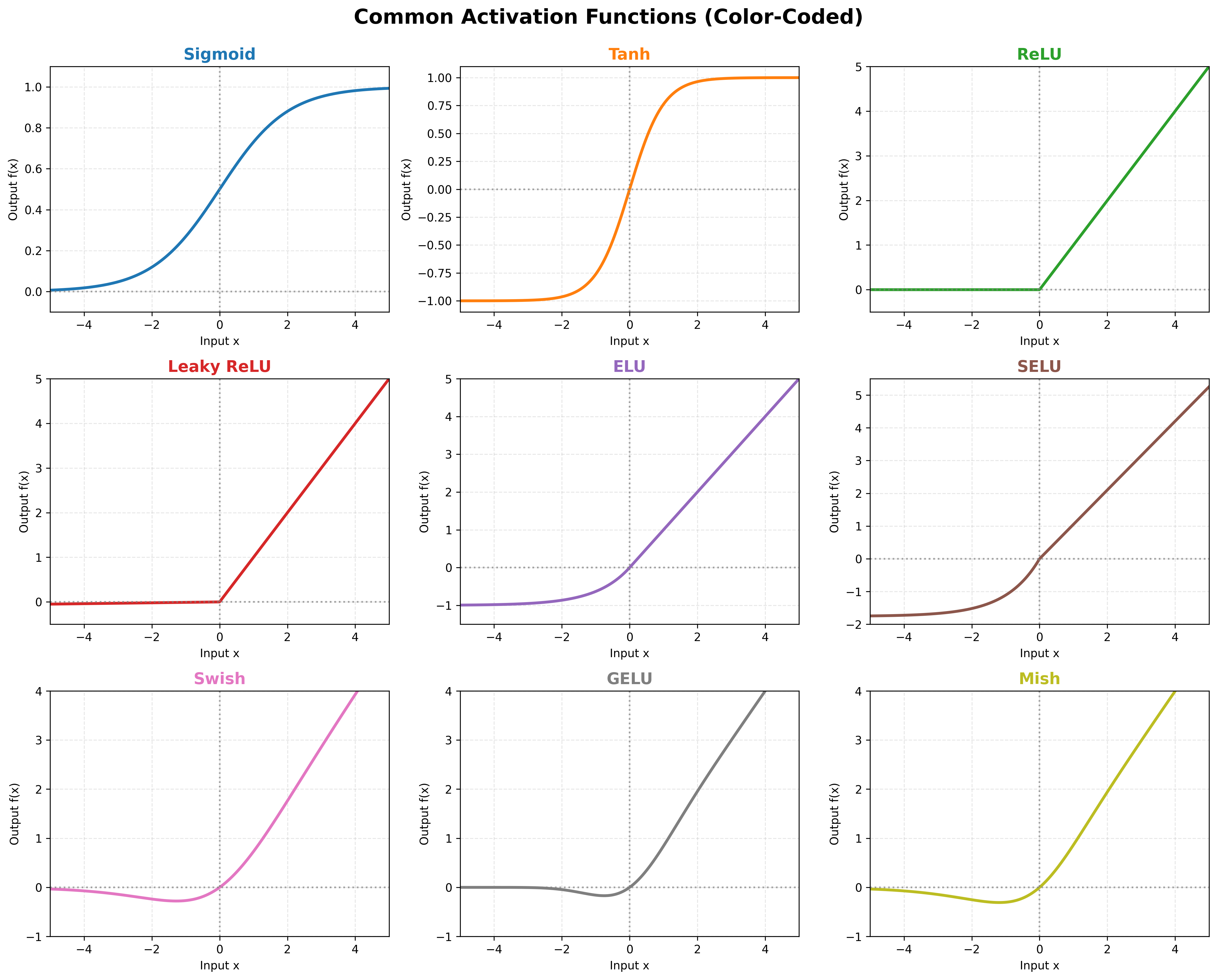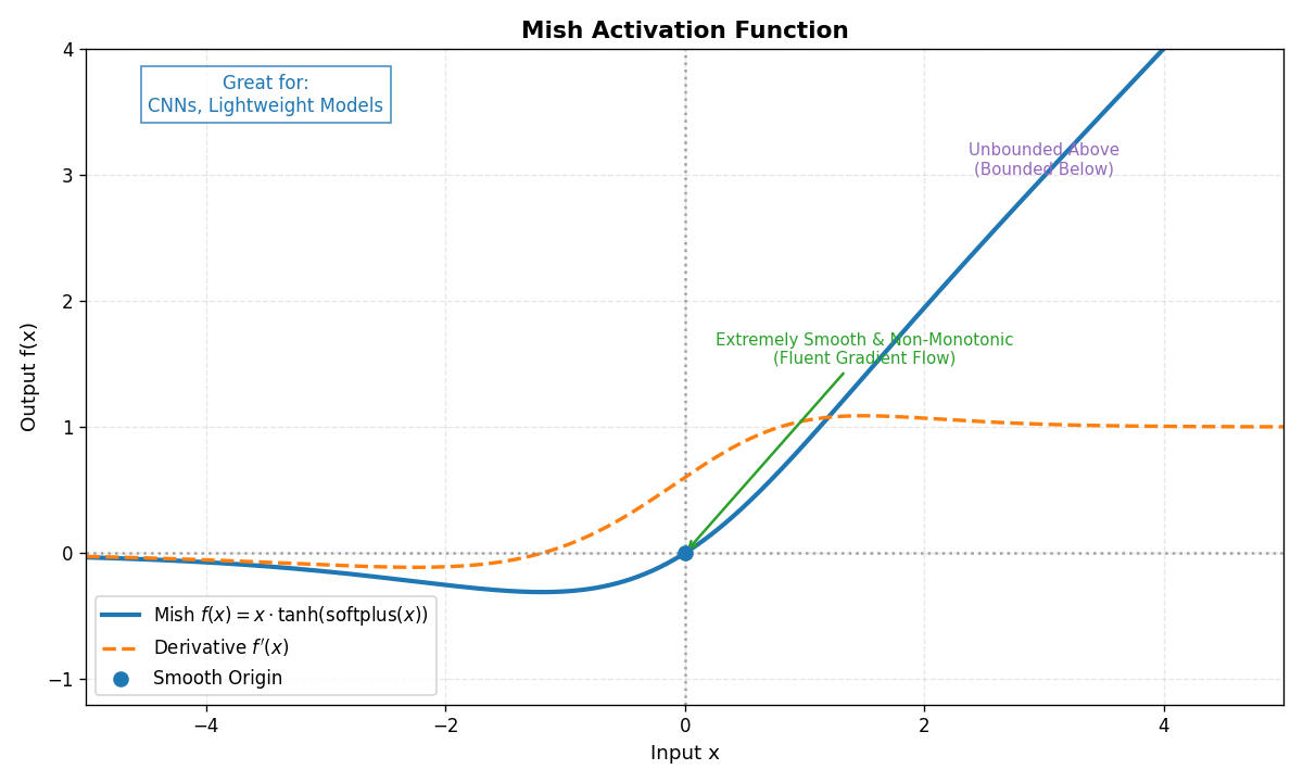 | Mish | f(x)=x⋅tanh(ln(1+ex))f(x) = x \cdot \tanh(\ln(1 + e^x))f(x)=x⋅tanh(ln(1+ex)) | (−∞,+∞)(-\infty, +\infty)(−∞,+∞) |
