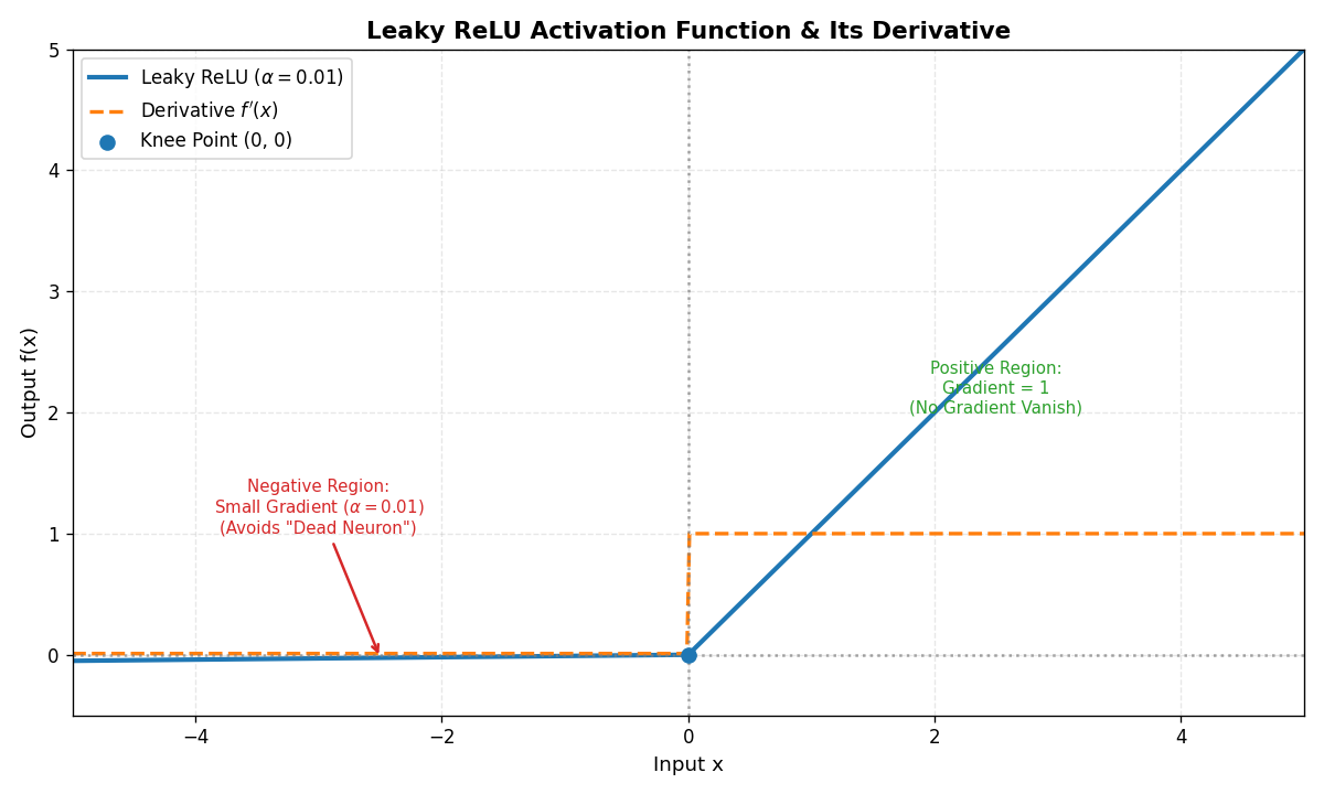 | Leaky ReLU | f(x)={xif x>0αxif x≤0f(x) = \begin{cases} x & \text{if } x > 0 \\ \alpha x & \text{if } x \leq 0 \end{cases}f(x)={xαxif x>0if x≤0 | (−∞,+∞)(-\infty, +\infty)(−∞,+∞) |
