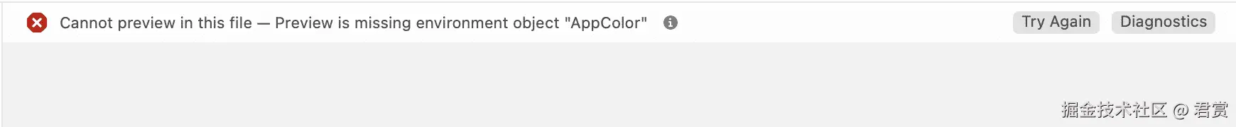 我们的预览失败了,但是一点都不慌,因为错误提示已经提示出来了。我们的预览试图没有设置 AppColor 的 Environment Object,想一下也是,刚才我们只是设置给程序入口设置了,但是预览没有设置。