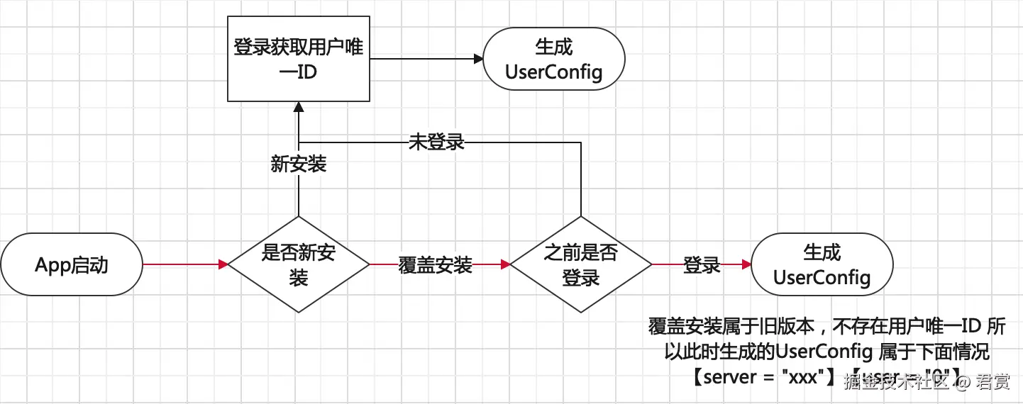 红色箭头的逻辑是有问题的,因为覆盖安装,旧版本已经登录情况下,用户操作的所有配置都保存在默认配置下面,是存在问题的。