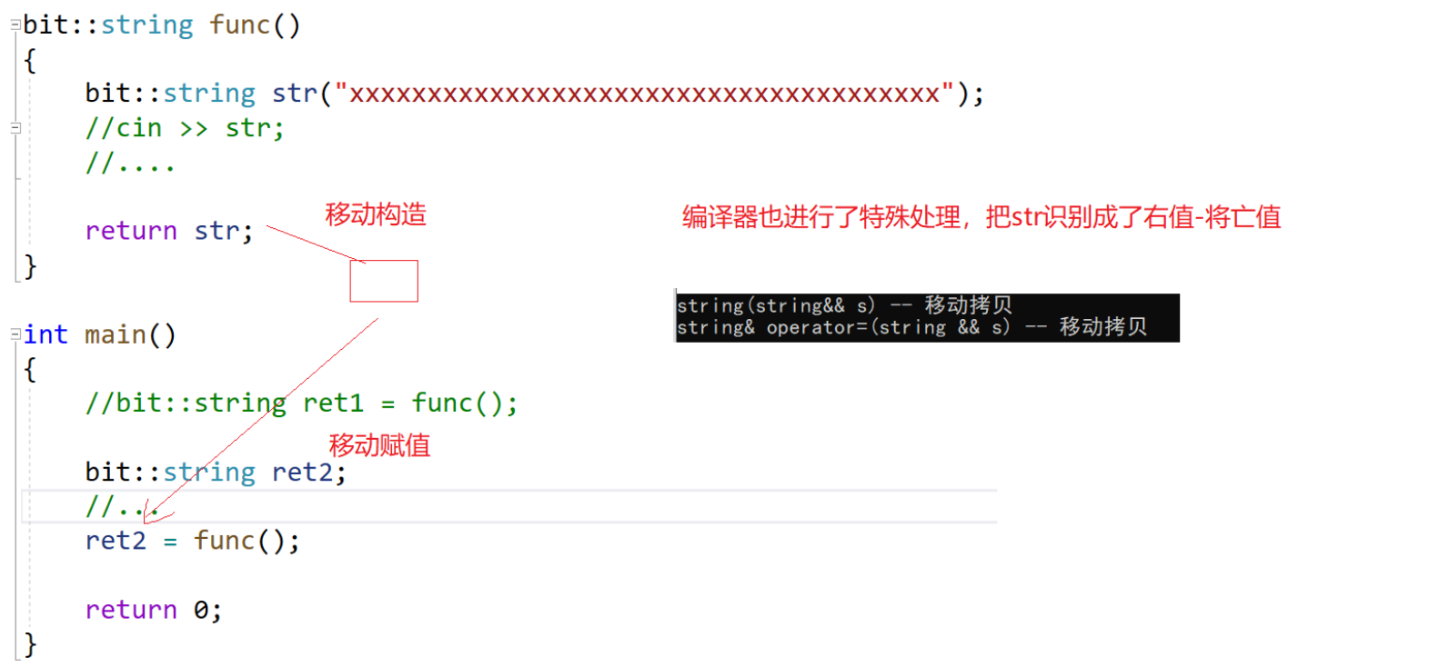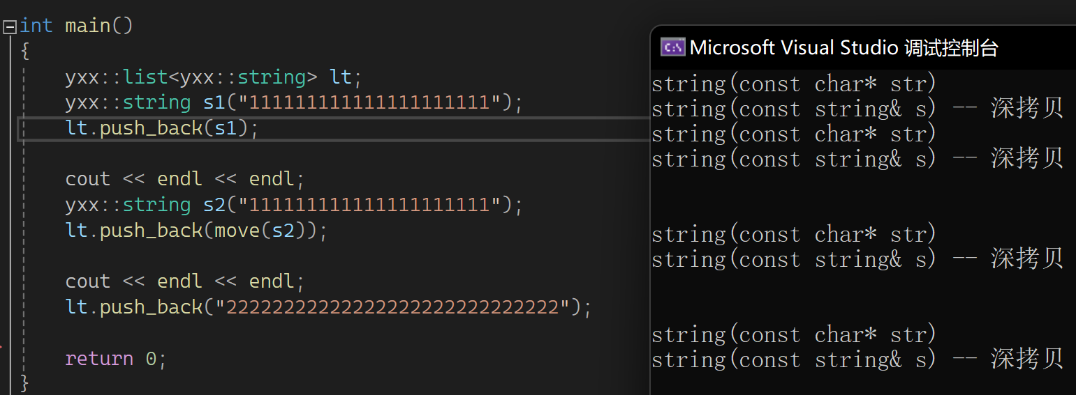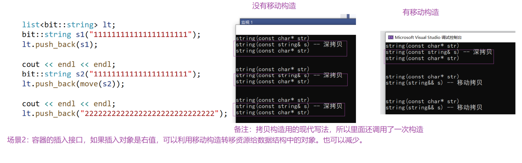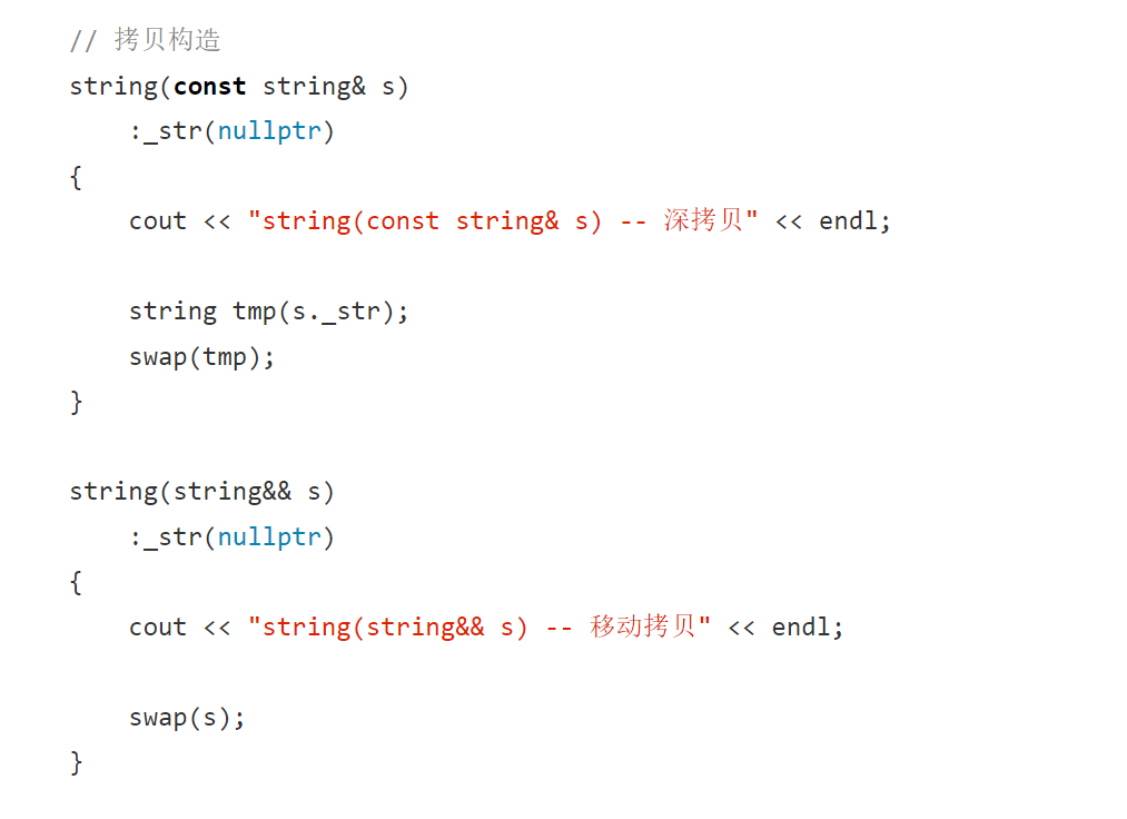 这样写也是一个移动构造,因为不能直接传值给string。先是构造临时或匿名对象,然后传左值过去资源转移。意味着这里比以前方式少拷贝一次,以前是构造+拷贝构造,现在是构造+移动构造。连续拷贝优化在同一行同一步骤,假如屏蔽移动构造,就都是构造+拷贝构造。那屏蔽后威慑右值也是深拷贝?
